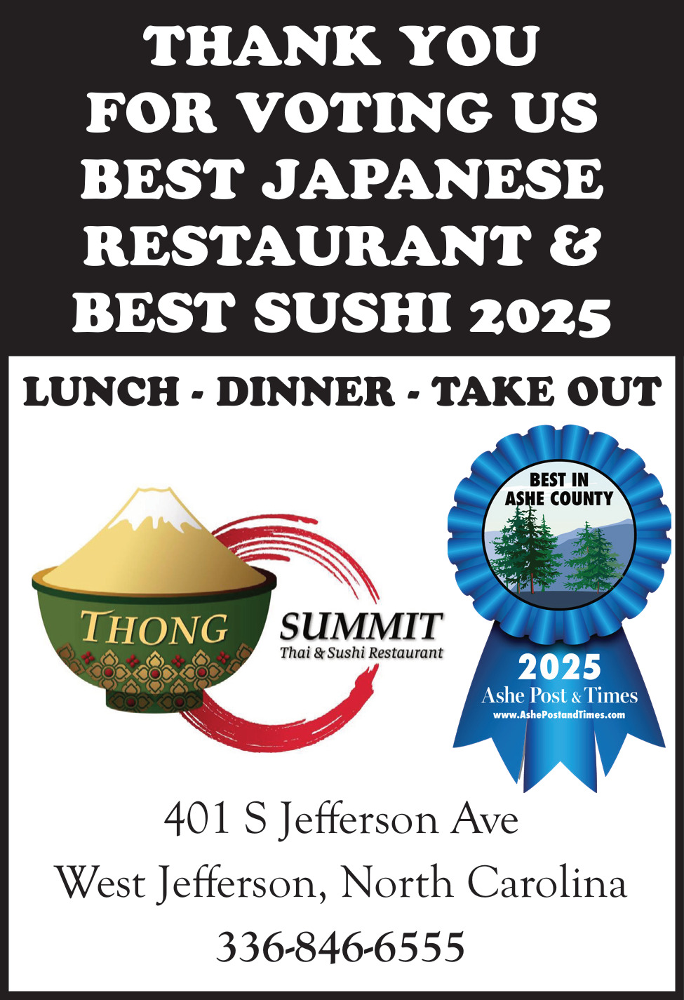 Jan 28, 2026. Thong Summit Restaurant Ads from Ashe Post & Times