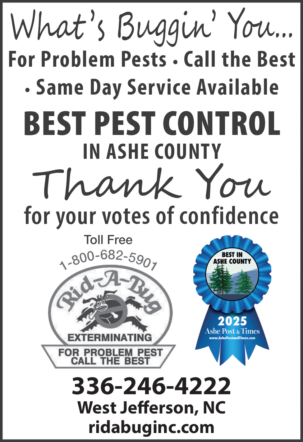 Jan 28, 2026. Rid-A-Bug Pest Control Ads from Ashe Post & Times